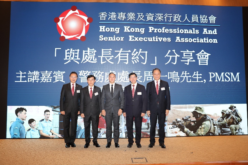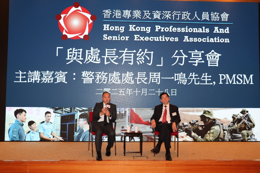 在瞬息萬變的時代,世界各地均面對新興犯罪趨勢等多項挑戰,而香港社會現時看似平靜,惟國安風險仍然存在。警務處處長周一鳴先生, PMSM 於 10月 28 日出席由香港專業及資深行政人員協會(下稱〝專資會〞)舉辦的「與處長有約」分享會,以「Asia's Finest」為主題,與該會會員分享於上任後如何帶領警隊提升自身能力,並繼續推進維護國家安全等重點工作。