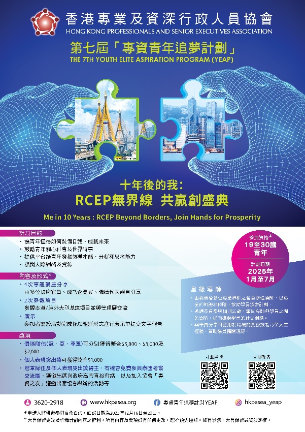 第七屆「專資青年追夢計劃」將於2026年1月至7月展開,新一屆主題是「十年後的我:RCEP無界線 共贏創盛典」,期望參加者透過活動能深入了解區域全面經濟夥伴關係協定(RCEP)中包括中國等15個經濟體之間的緊密合作關係,以及準確掌握香港在當中所扮演的角色。現誠邀合資格的年輕人報名參加。