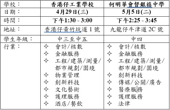 本會已落實將協助10間中學舉辦「卓育菁莪」中學生生涯規劃講座,期望學生能透過活動,加深了解不同行業的情況和要求,及早規劃人生,好好裝備自己。現誠邀會員擔任或邀請友好擔任2026年4月份及5月份兩所中學的分享嘉賓。有關詳情如下: